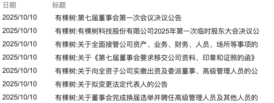 10月10日,有棵树连发多条公告,宣告第七届董事会成员上任。新的高管团队全面接管公司资产、业务、财务、人员、场所等事项。