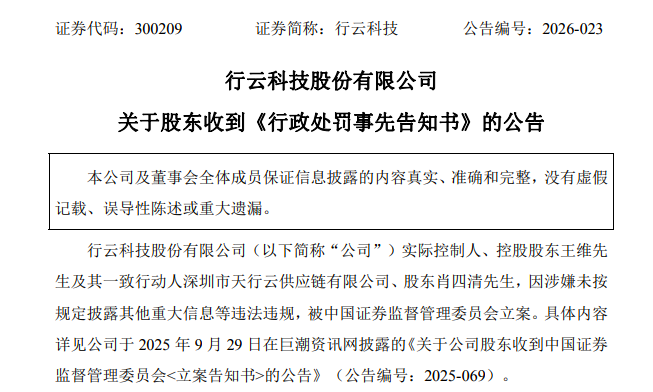 3月17日,行云科技(原有棵树)发布公告,公司实际控制人王维、一致行动人深圳市天行云供应链有限公司、股东肖四清三方,因“涉嫌未按规定披露重大信息”,收到了证监会湖南监管局的《行政处罚事先告知书》,三人合计被罚1000万元。