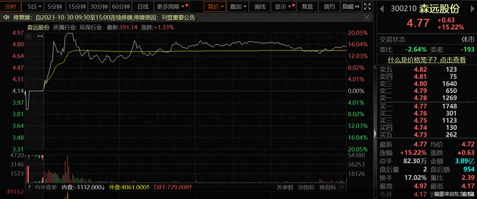 截至当日收盘,森远股份大幅收涨15.22%,股价报4.77元/股,总市值为23.1亿元,当日成交金额3.89亿元,较前几个交易日出现明显放量。