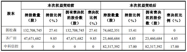 同日,郭松森与中科信控签订了《表决权放弃协议》,郭松森将放弃其持有的公司74,602,351股股份所对应的表决权。
