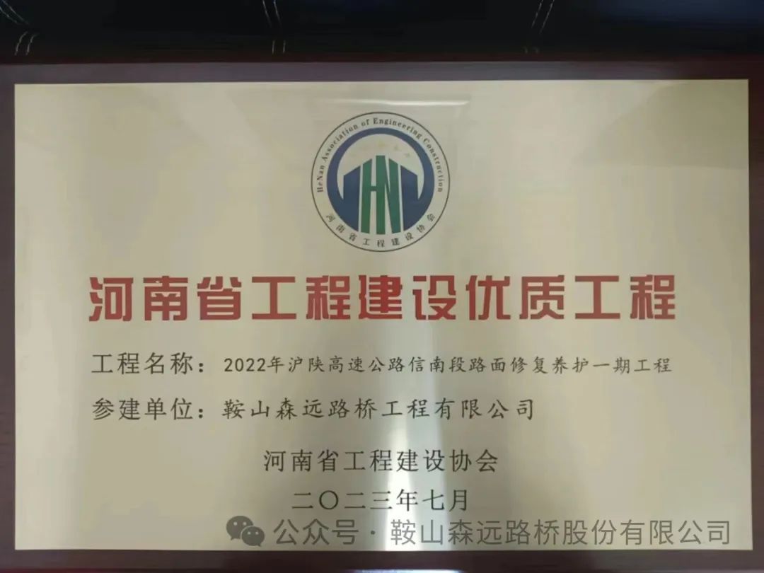 1月13日,“第五届公路建设高质量大会暨2022-2023年度公路交通优质工程奖表彰大会”在武汉市隆重召开。森远路桥工程公司“2022年沪陕高速公路信南段路面修复养护一期工程”荣获“2022-2023年度公路交通优质工程奖”,是河南省首个获得此荣誉的高速公路养护工程。