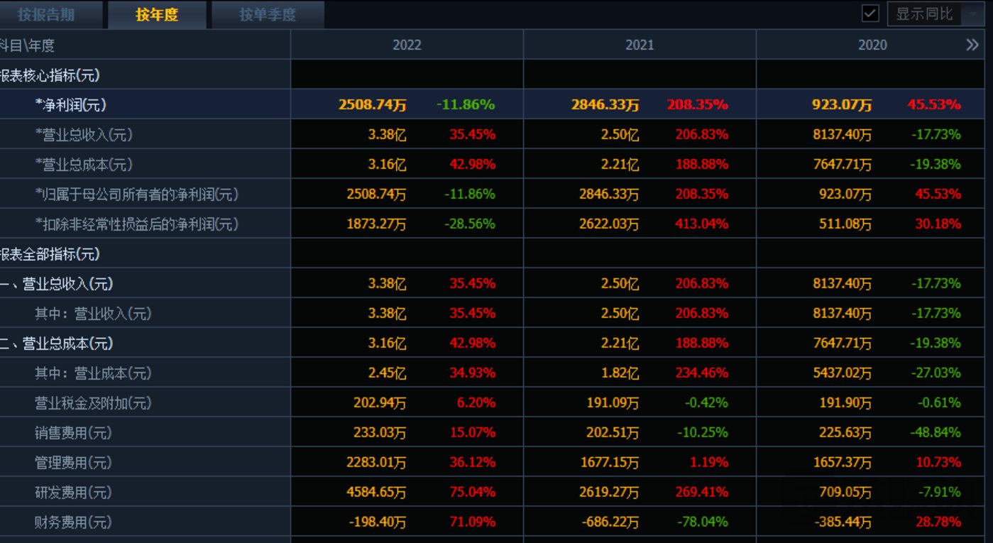 2022年亿通科技实现营收3.38亿元,同比上涨35.45%;实现归母净利润2508.74万元,同比下滑11.86%;扣非归母净利润为1873.27万元,同比下滑28.56%。