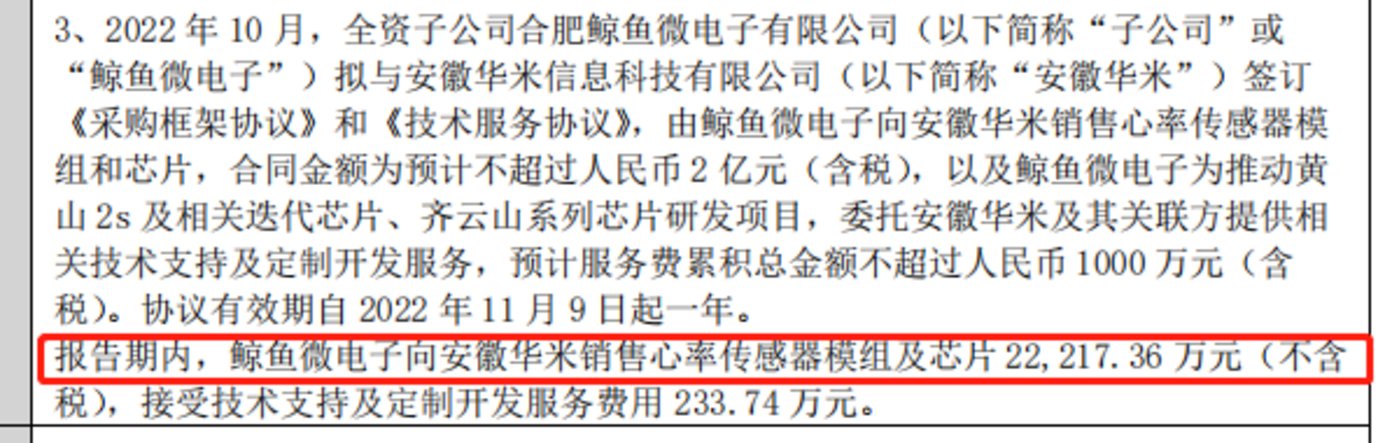 报告期内鲸鱼微电子实现收入22310.08万元,实现毛利5924.69万元。其中,传感器模组实现收入22244.43万元,占总营收比重为66.15%;黄山2S芯片、研发技术服务分别实现收入16.25万元、49.4万元,占总营收比重为0.05%、0.15%。