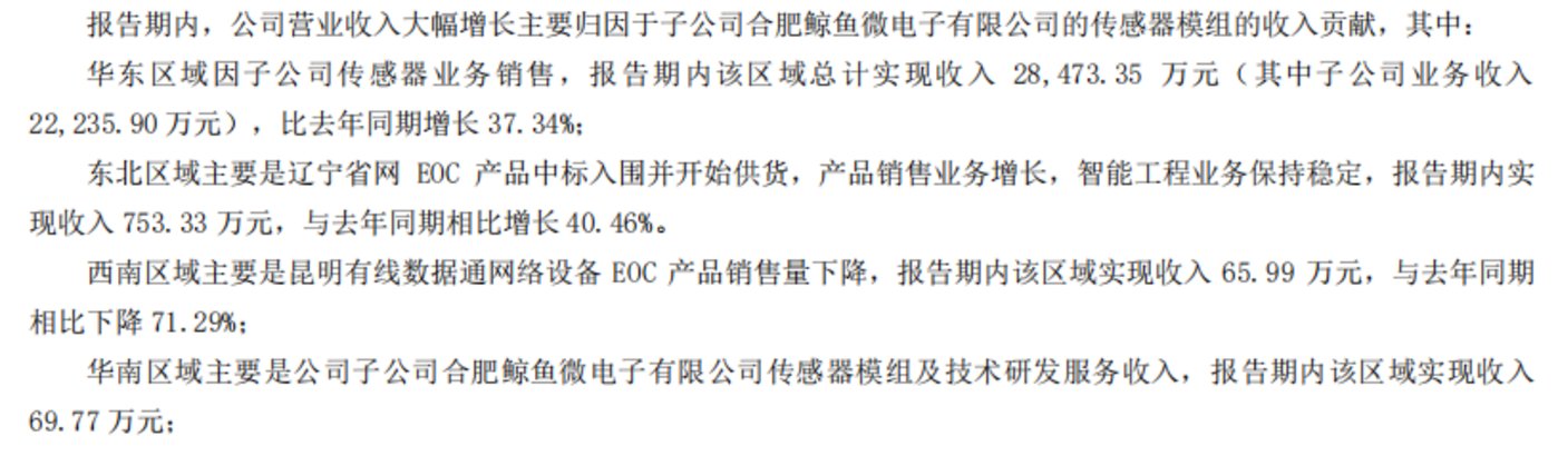 分区域来看,亿通科技区域收入并不平衡,报告期内华东区域收入占比达84.66%。因鲸鱼微电子传感器业务销售增长,华东区域实现收入28473.35万元,其中鲸鱼微电子业务收入22235.9万元,占比为78%。华南区域收入也主要来自鲸鱼微电子,报告期内销售占比激增42089.20%,但收入仅69.82万元。