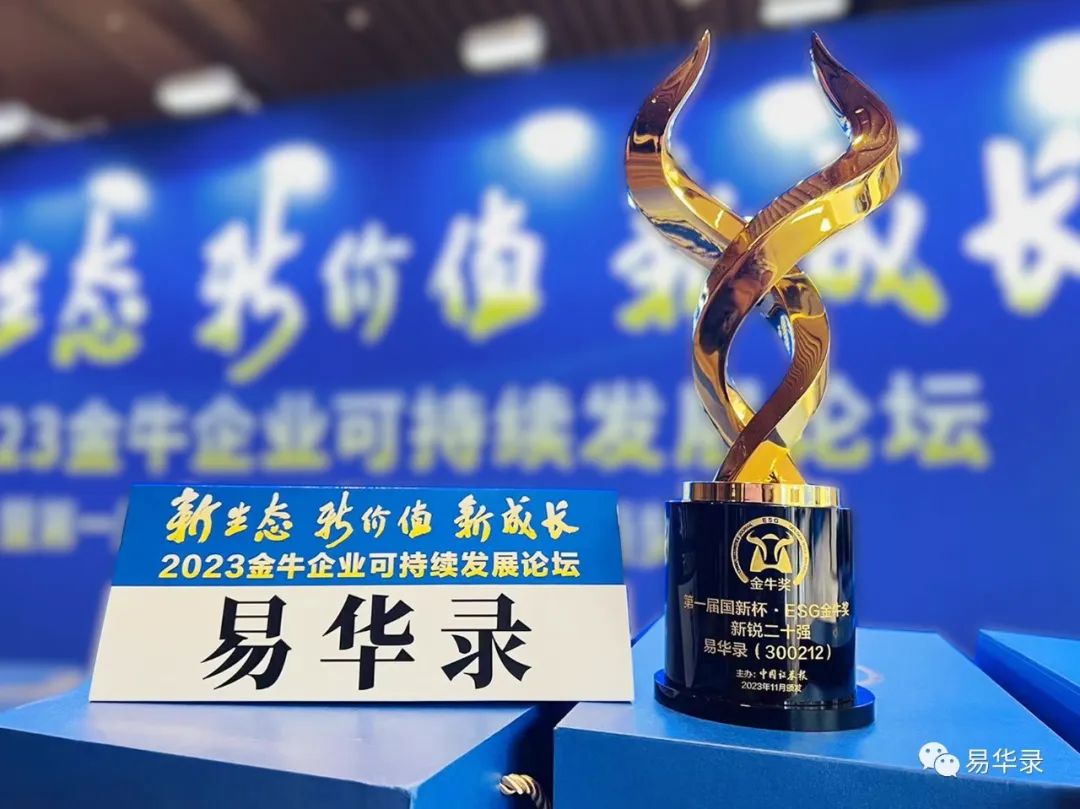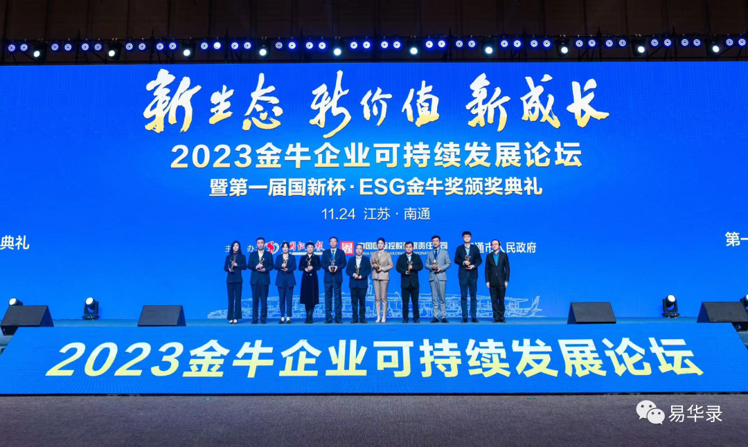 11月24日,由中国证券报、中国国新控股有限责任公司、南通市人民政府联合主办的“新生态新价值新成长——2023金牛企业可持续发展论坛暨第一届国新杯·ESG金牛奖颁奖典礼”在江苏南通举行。现场重磅揭晓第一届国新杯·ESG金牛奖8个奖项,易华录获颁“第一届国新杯·ESG金牛奖新锐二十强”。