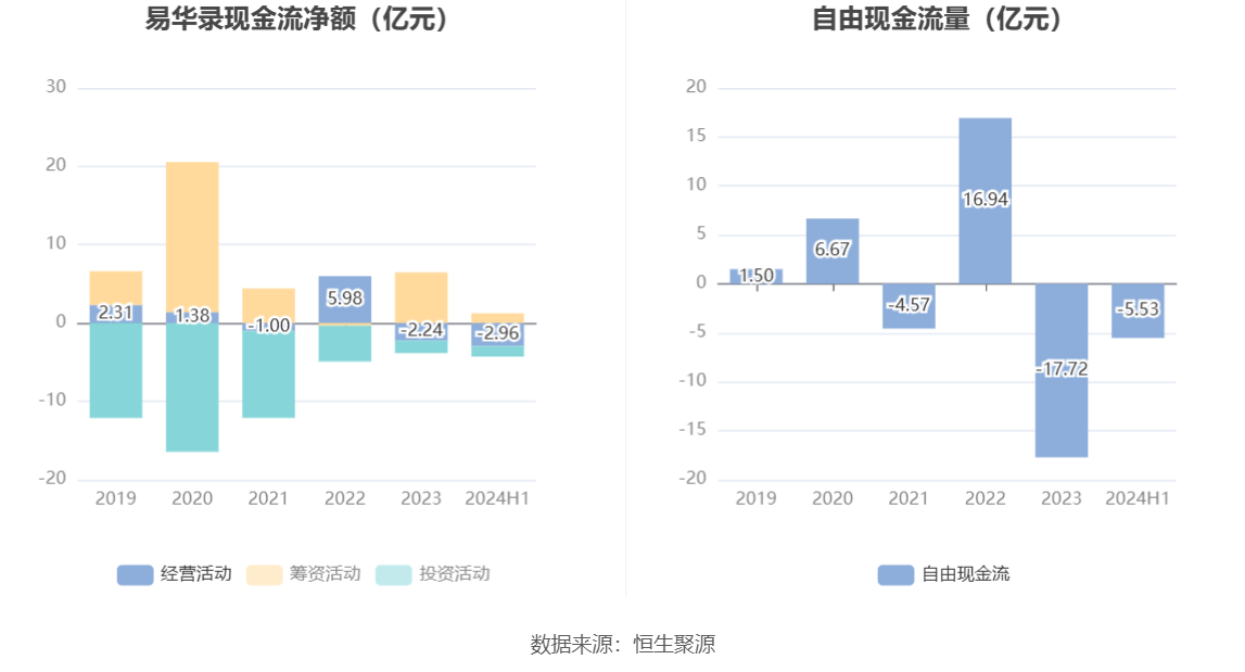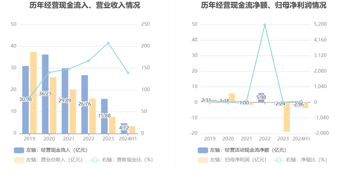 进一步统计发现,2024年上半年公司自由现金流为-5.53亿元,上年同期为-9.86亿元。