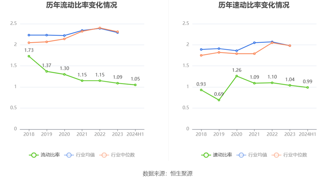 2024年上半年,公司流动比率为1.05,速动比率为0.99。