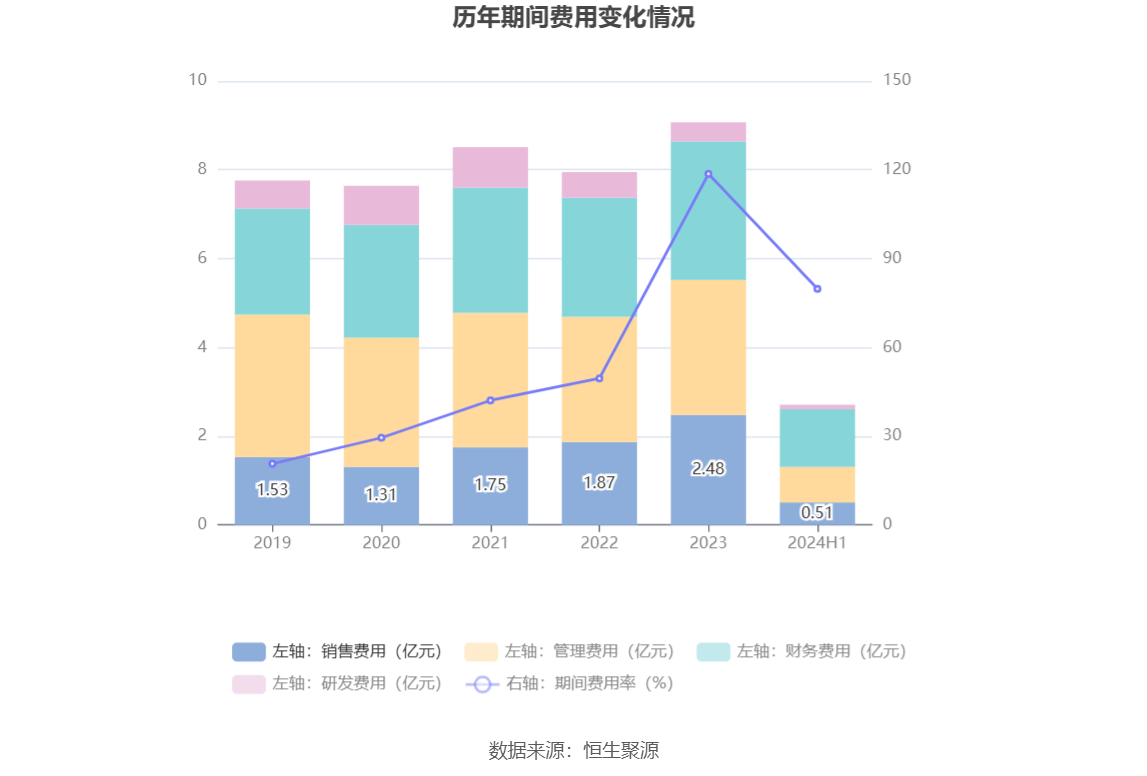 2024年上半年,公司期间费用为2.70亿元,较上年同期减少1.27亿元;但期间费用率为79.79%,较上年同期上升2.76个百分点。其中,销售费用同比下降51.9%,管理费用同比下降39.52%,研发费用同比下降54.83%,财务费用同比下降5.94%。