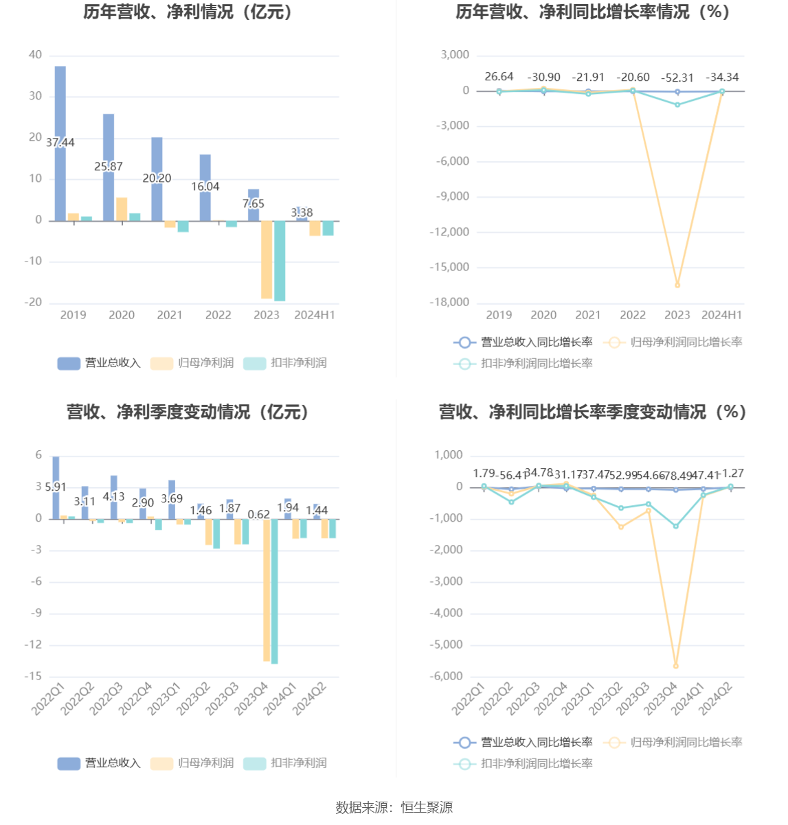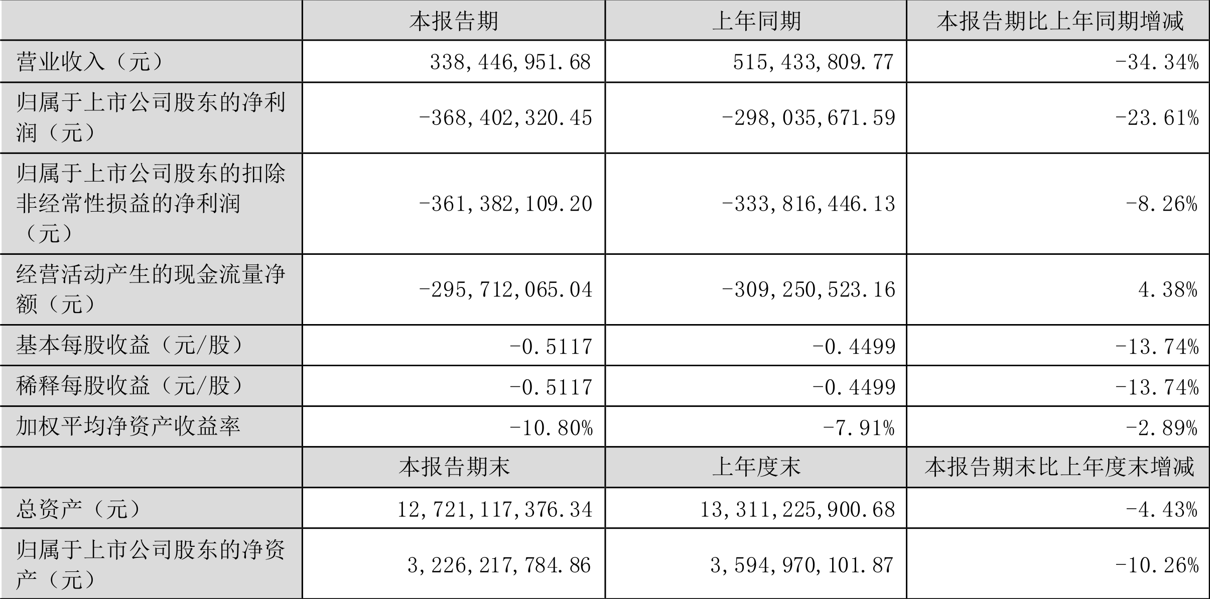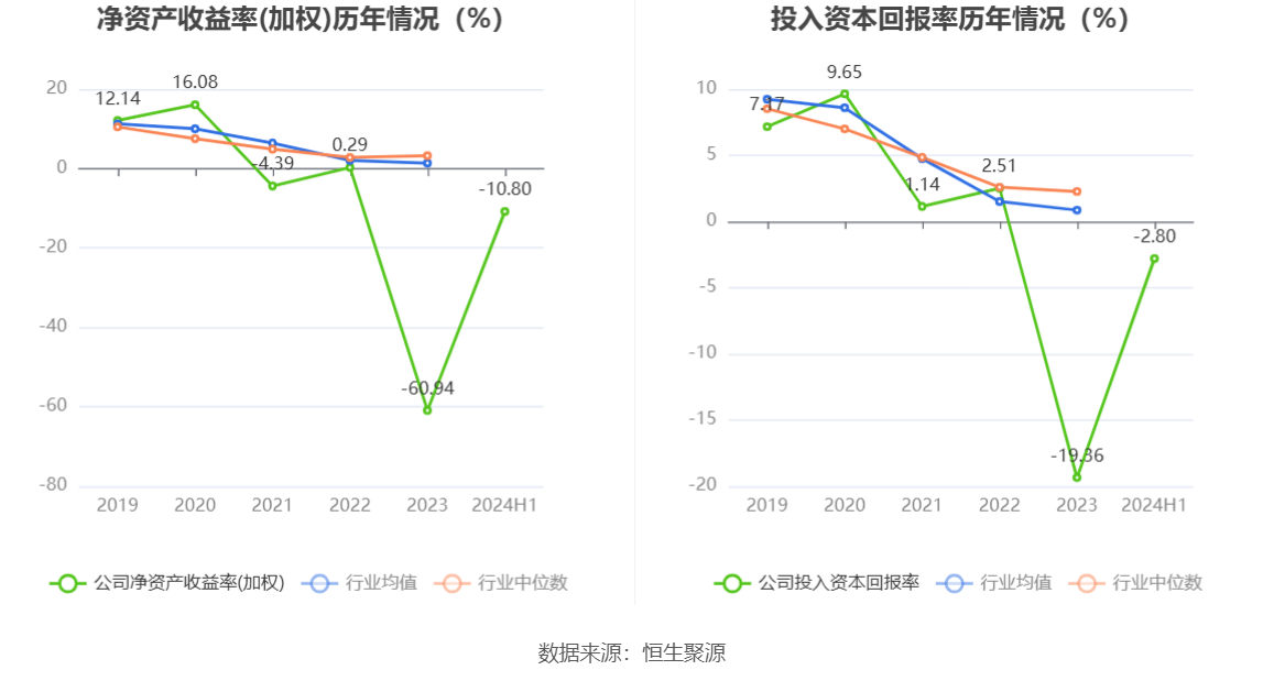 数据显示,2024年上半年公司加权平均净资产收益率为-10.80%,较上年同期下降2.89个百分点;公司2024年上半年投入资本回报率为-2.80%,较上年同期下降1.02个百分点。