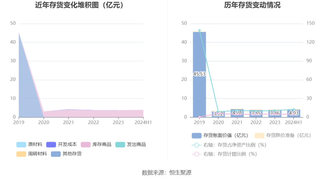 从存货变动来看,截至2024年上半年末,公司存货账面价值为4.03亿元,占净资产的12.5%,较上年末增加1765.51万元。其中,存货跌价准备为2016.83万元,计提比例为4.76%。