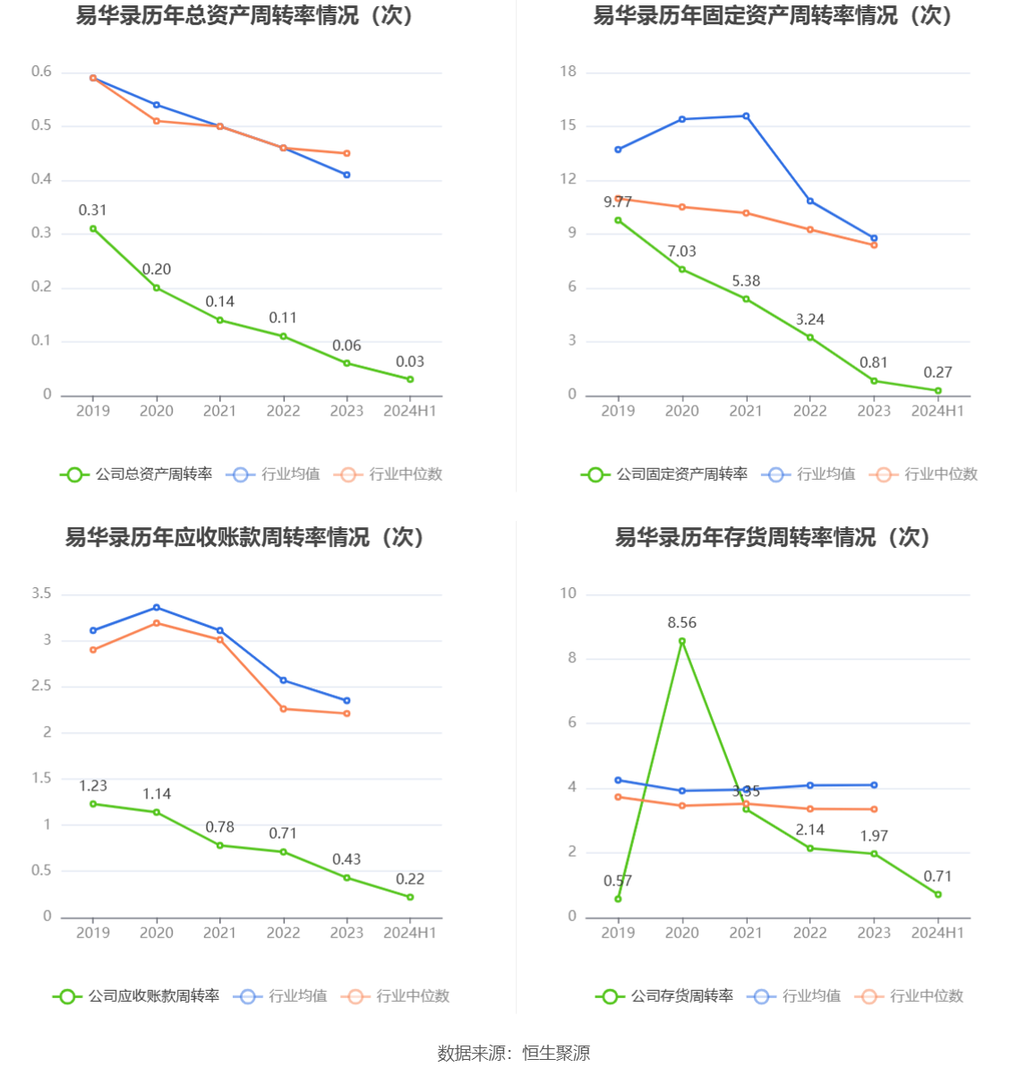 营运能力方面,2024年上半年,公司总资产周转率为0.03次,上年同期为0.04次(2023年上半年行业平均值为0.19次,公司位居同行业130/131);固定资产周转率为0.27次,上年同期为0.69次(2023年上半年行业平均值为4.24次,公司位居同行业120/131);公司应收账款周转率、存货周转率分别为0.22次、0.71次。