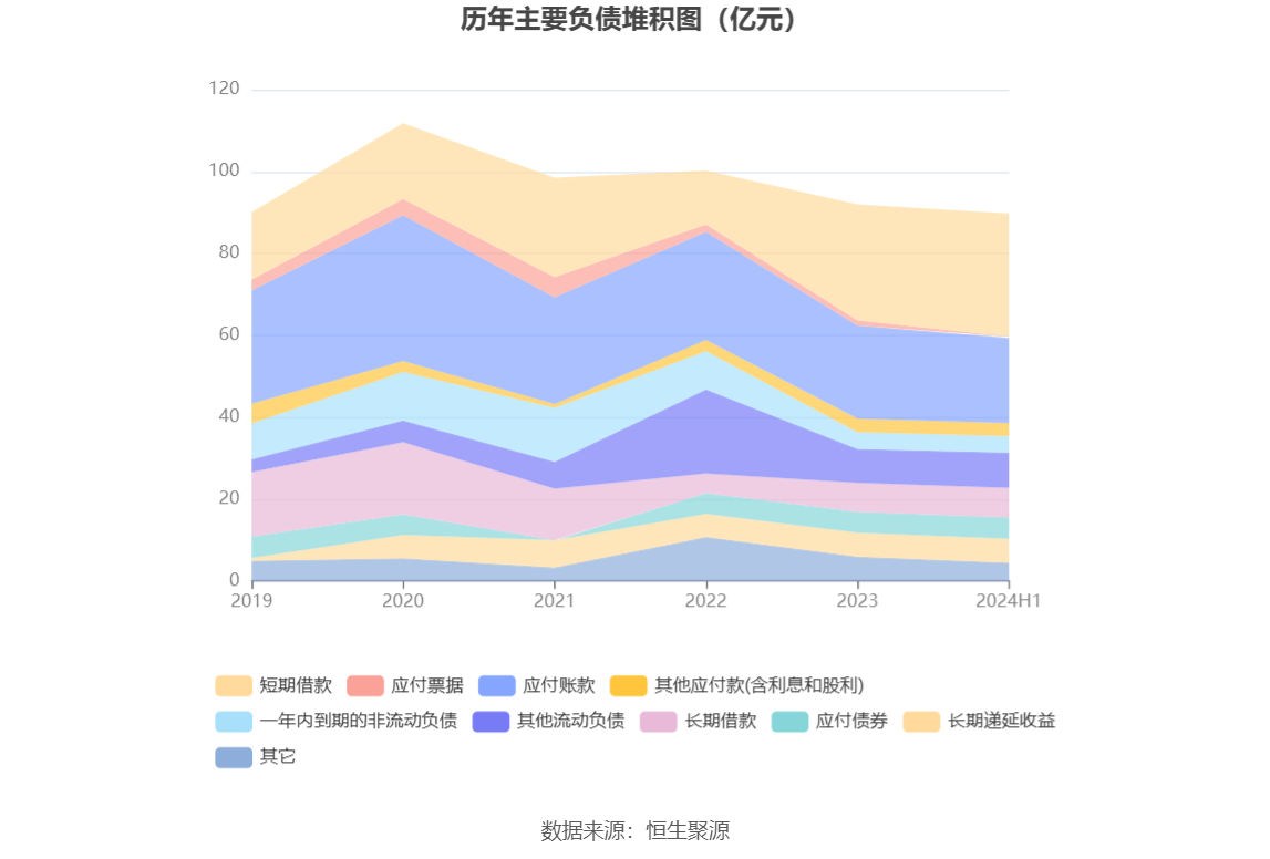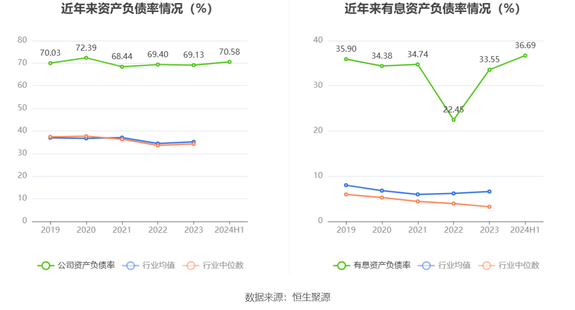 在偿债能力方面,公司2024年上半年末资产负债率为70.58%,相比上年末上升1.45个百分点;有息资产负债率为36.69%,相比上年末上升3.14个百分点。