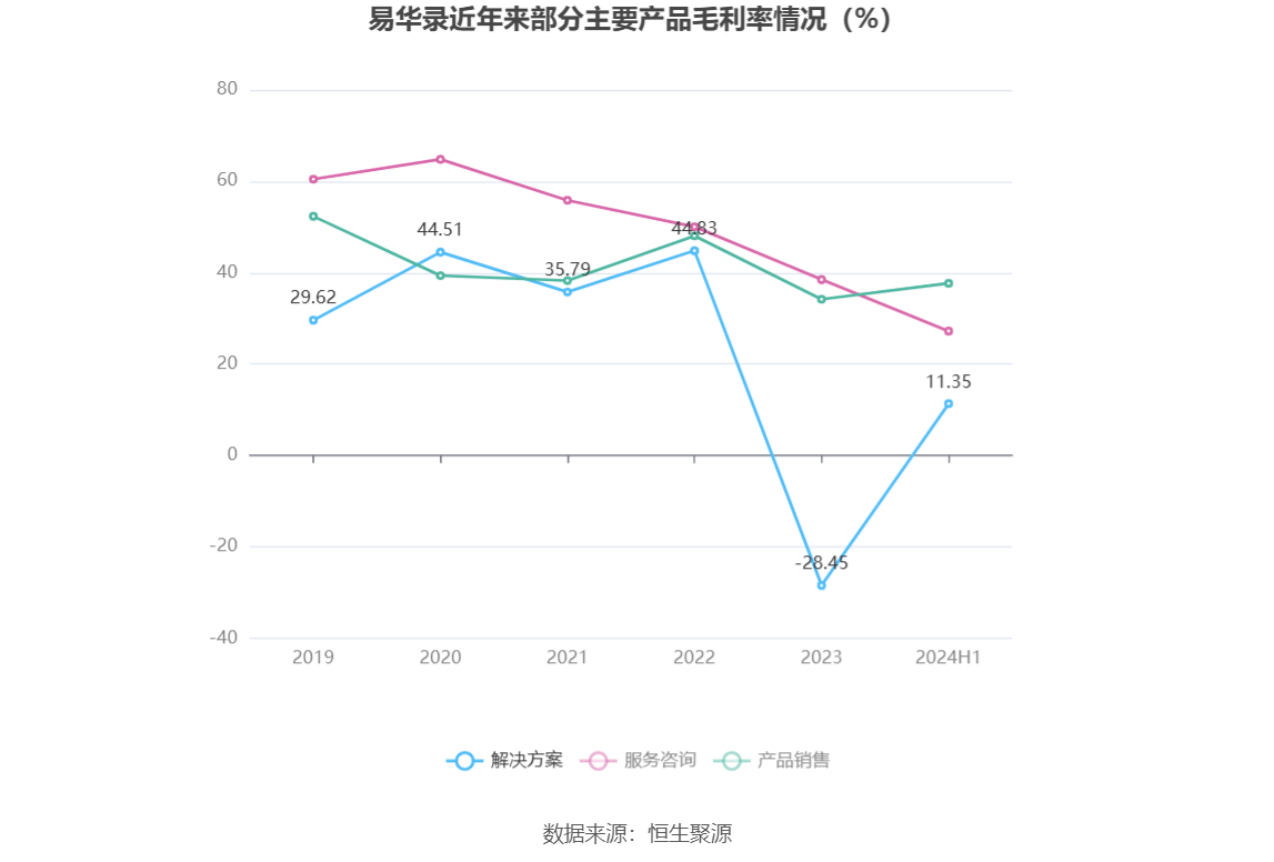 分产品看,解决方案、服务咨询、产品销售2024年上半年毛利率分别为11.35%、27.24%、37.69%。
