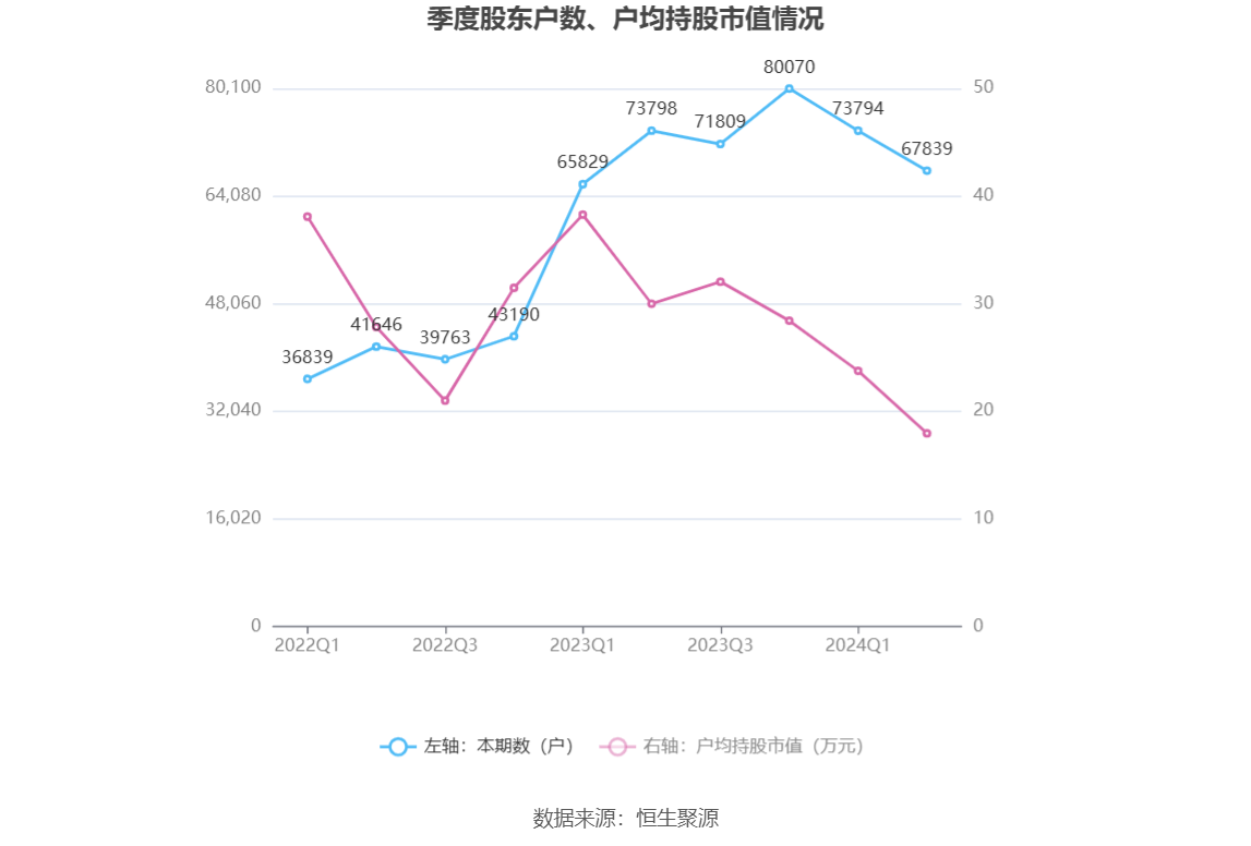 筹码集中度方面,截至2024年上半年末,公司股东总户数为6.78万户,较一季度末下降了5955户,降幅8.07%;户均持股市值由一季度末的23.75万元下降至17.94万元,降幅为24.46%。