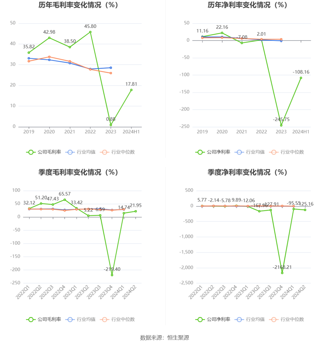 2024年上半年,公司毛利率为17.81%,同比下降7.62个百分点;净利率为-108.16%,较上年同期下降51.94个百分点。从单季度指标来看,2024年第二季度公司毛利率为21.95%,同比上升16.73个百分点,环比上升7.21个百分点;净利率为-125.16%,较上年同期上升42.80个百分点,较上一季度下降29.61个百分点。