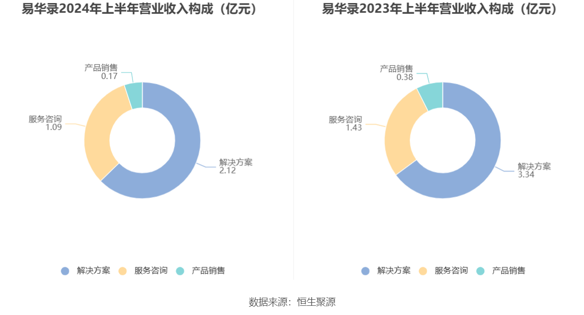 分产品来看,2024年上半年公司主营业务中,解决方案收入2.12亿元,同比下降36.52%,占营业收入的62.69%;服务咨询收入1.09亿元,同比下降23.70%,占营业收入的32.21%;产品销售收入0.17亿元,同比下降54.95%,占营业收入的5.11%。