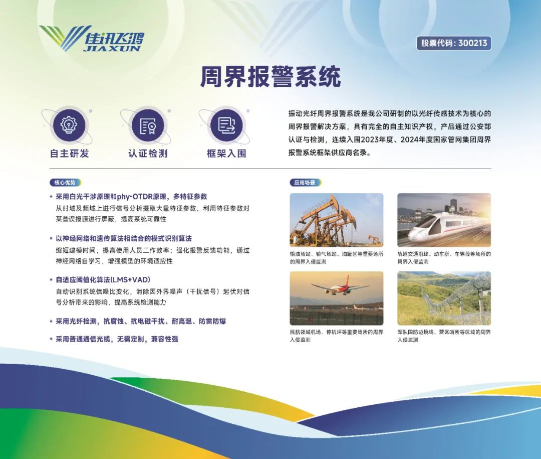 在能源管输领域,安全始终是核心关注点。佳讯飞鸿展出的周界报警系统基于光纤传感技术,采用白光干涉原理和phy-OTDR原理,结合神经网络与遗传算法的模式识别技术,实现了高精度、低误报的周界入侵监测能力。同时,系统通过自适应阈值化算法(LMS+VAD),能够自动识别信噪比变化,结合人工智能技术,有效消除外界干扰信号对检测结果的影响,进一步提升系统可靠性。