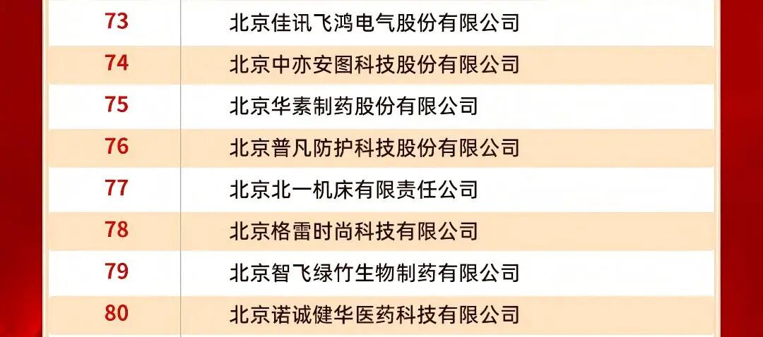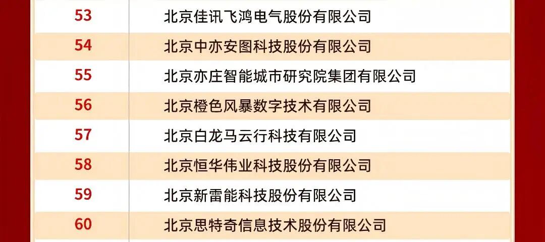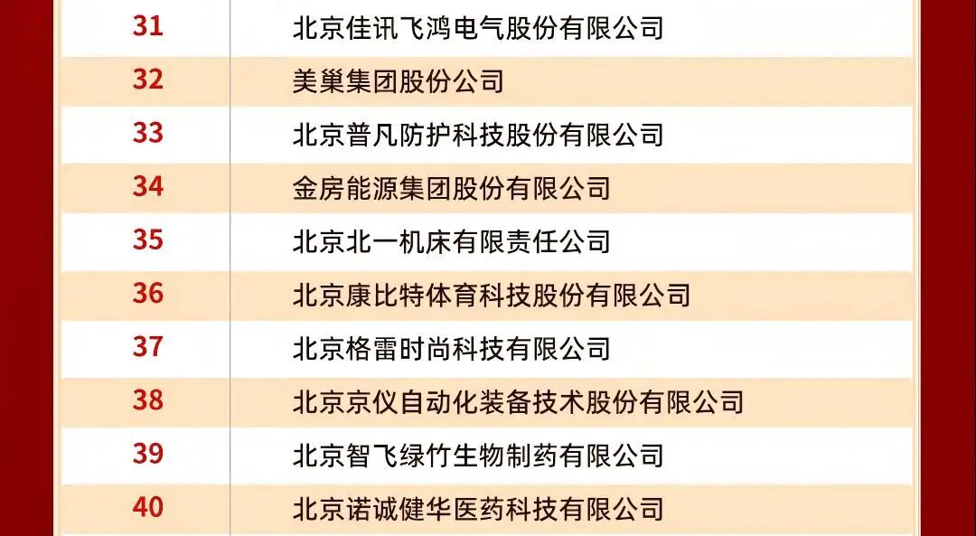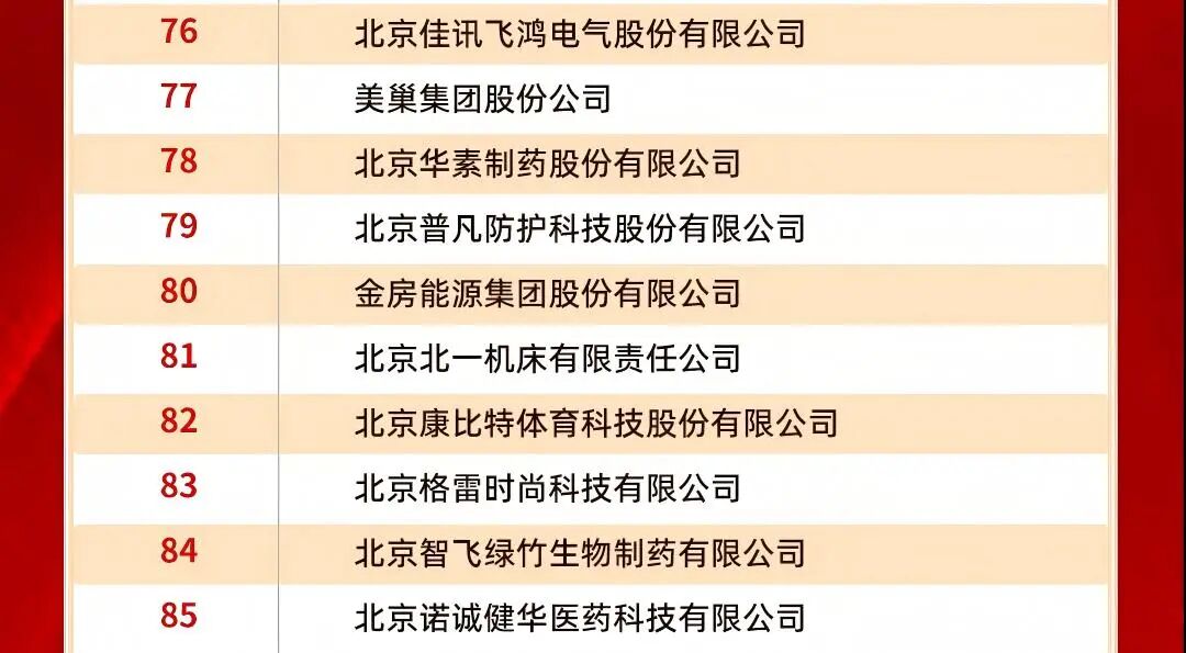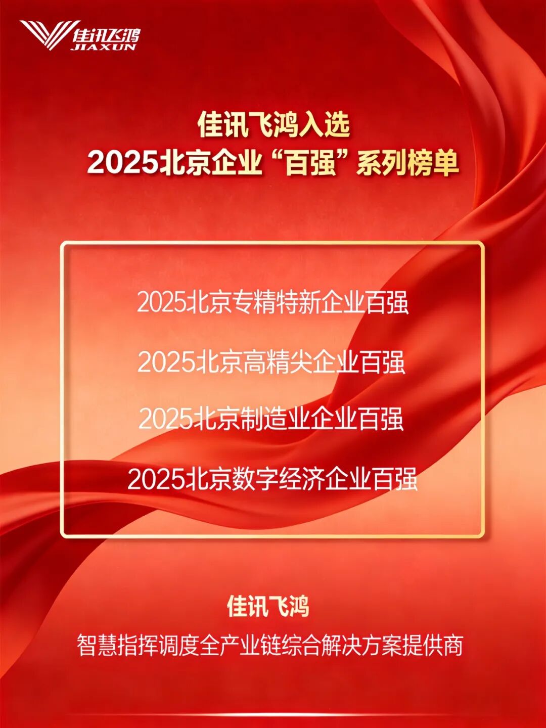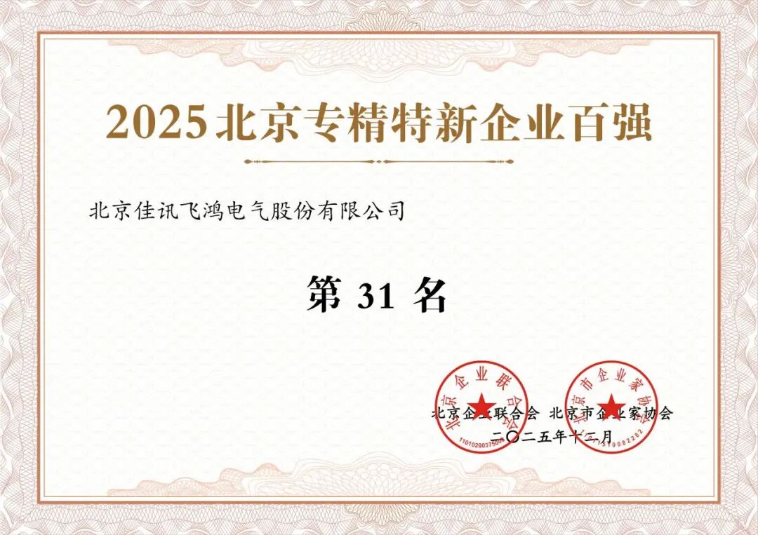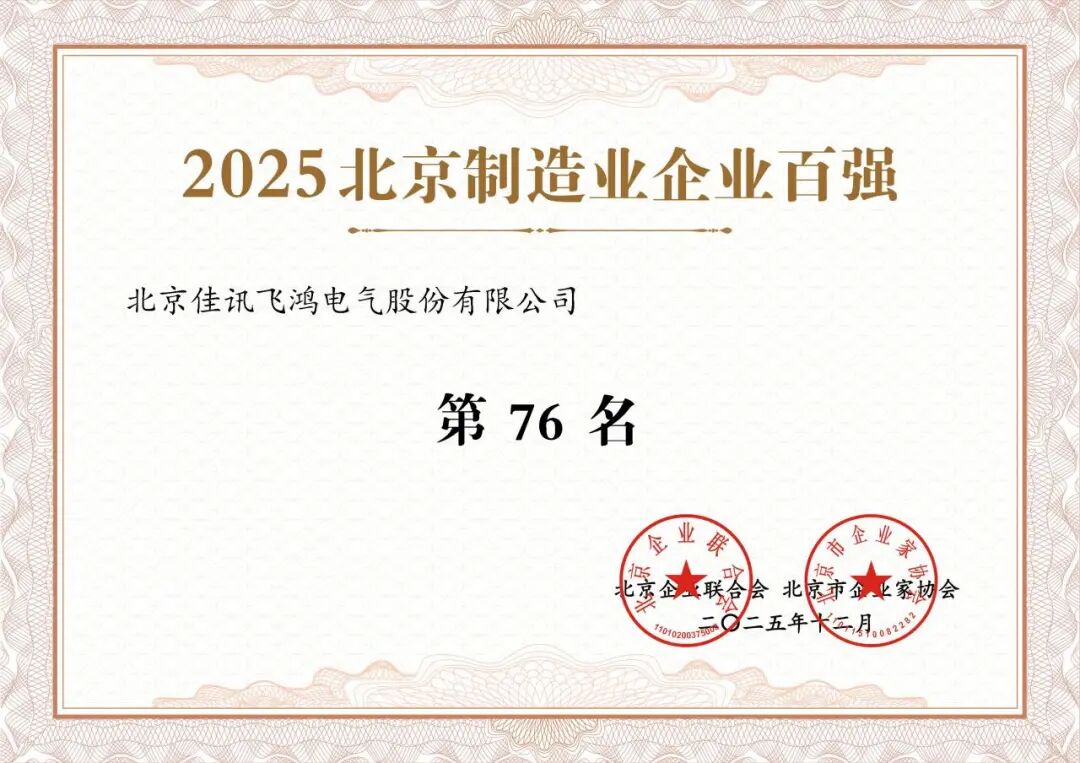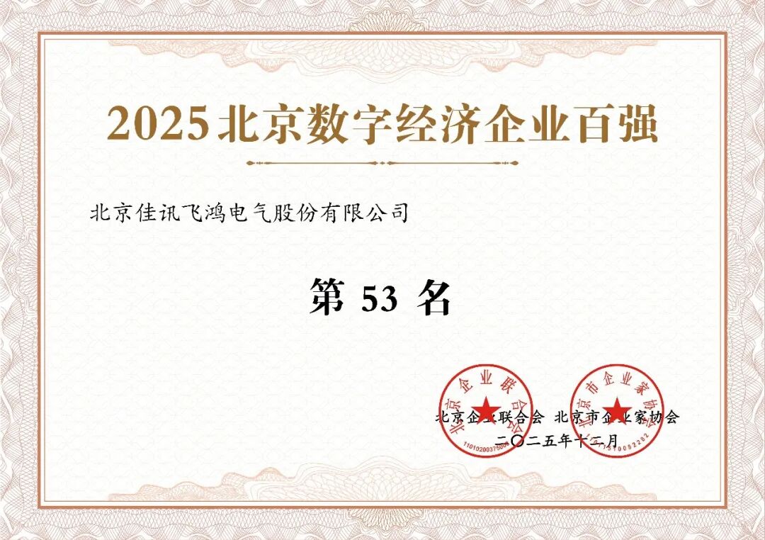 北京佳讯飞鸿电气股份有限公司(以下简称“佳讯飞鸿”,股票代码:300213)凭借在制造业领域的深厚积淀、高精尖技术的创新突破、专精特新的发展优势及数字经济领域的融合实践成效,成功跻身“2025北京制造业企业百强名单”“2025北京高精尖企业百强名单”“2025北京专精特新企业百强榜单”“2025北京数字经济企业百强”四大权威榜单,全方位彰显了企业在首都经济高质量发展浪潮中的综合核心竞争力。