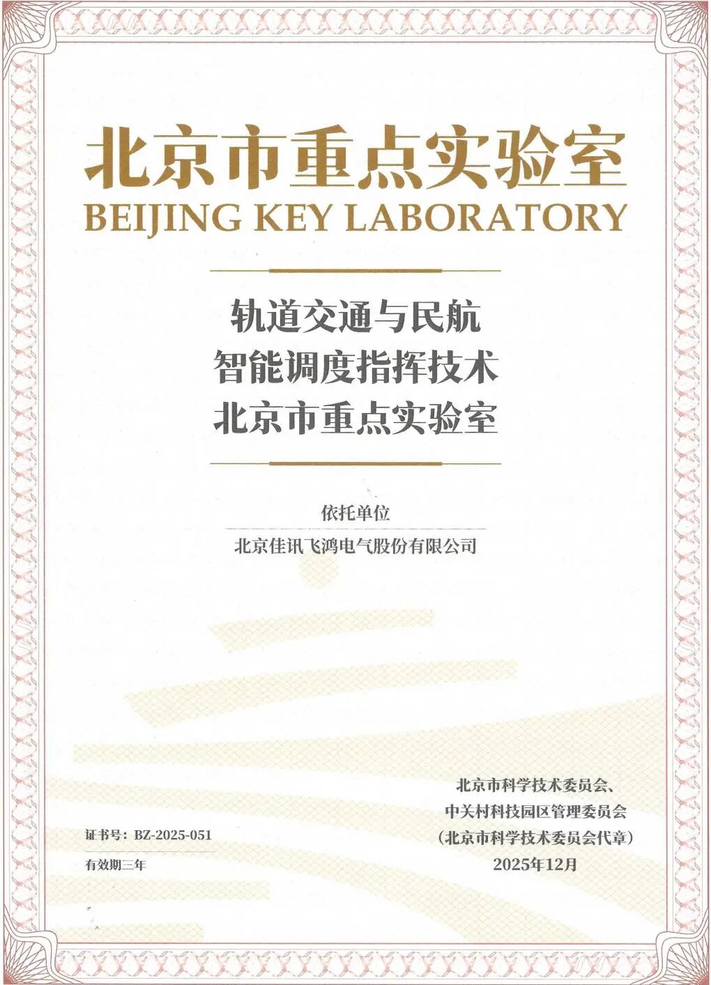 近日,北京市科学技术委员会、中关村科技园区管理委员会公布2025年北京市重点实验室认定名单。北京佳讯飞鸿电气股份有限公司(以下简称“佳讯飞鸿”,股票代码:300213)申报的“轨道交通与民航智能调度指挥技术北京市重点实验室”正式获批,标志着公司在智能调度指挥领域的科研实力与产业引领地位获得省部级权威认可,也将为北京市建设“AI+交通运输”创新高地注入强劲动力。