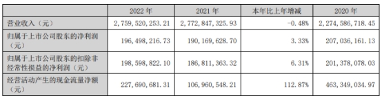 此前,日科化学于4月21日发布的2022年年度报告显示,2022年,公司实现营业收入27.60亿元,同比减少0.48%;归属于上市公司股东的净利润1.96亿元,同比增长3.33%;归属于上市公司股东的扣除非经常性损益的净利润1.99亿元,同比增长6.31%;经营活动产生的现金流量净额2.28亿元,同比增长112.87%。