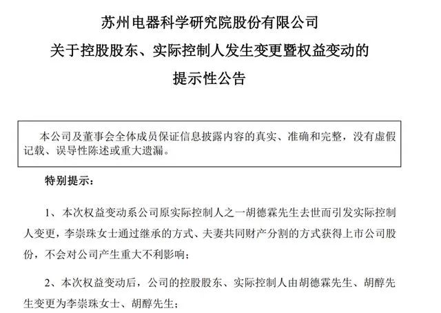 7月19日盘后,电科院披露实控人发生变更提示性公告,因公司原实控人之一胡德霖去世,公司控股股东、实控人由胡德霖、胡醇变更为李崇珠、胡醇。