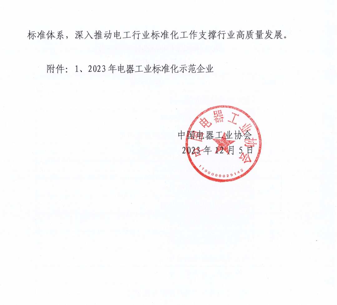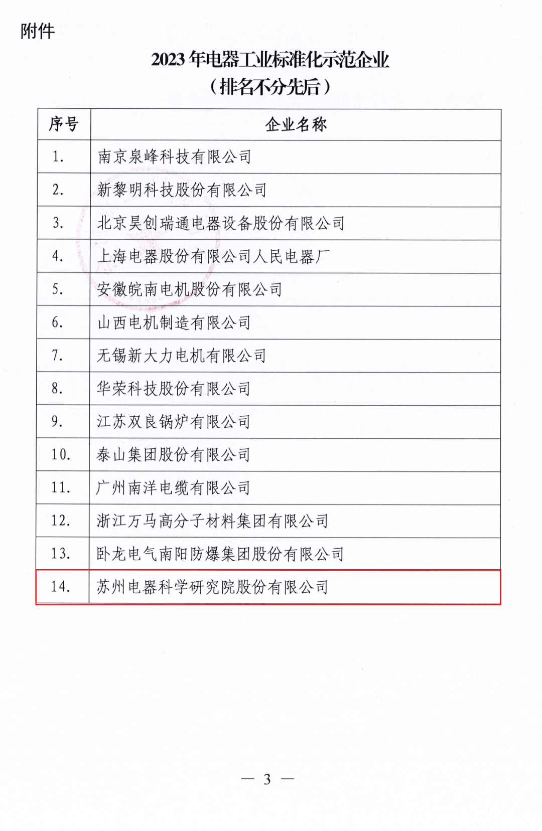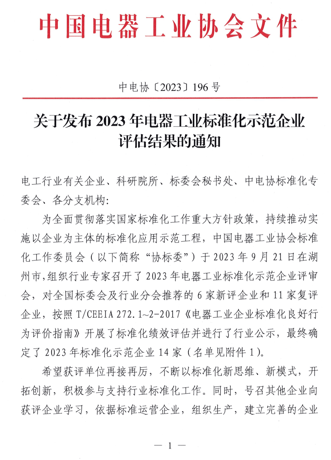 近日,苏州电器科学研究院股份有限公司荣获中国电器工业协会发布的“2023电器工业标准化示范企业”称号。苏州电科院的入选及最终获评,充分体现了公司作为行业头部优势企业,在标准化体系建设和标准引领示范方面所取得的卓有成效的业绩和成果。