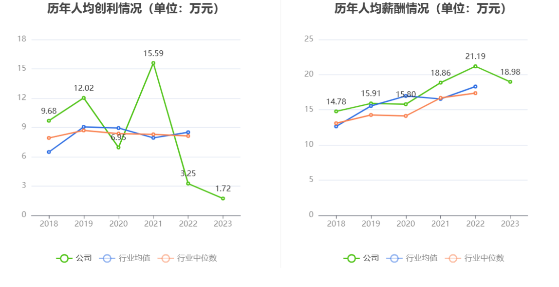 截至2023年末,公司员工总数为1111人,人均创收55.90万元,人均创利1.72万元,人均薪酬18.98万元,较上年同期分别下降12.71%、47.06%、10.42%。