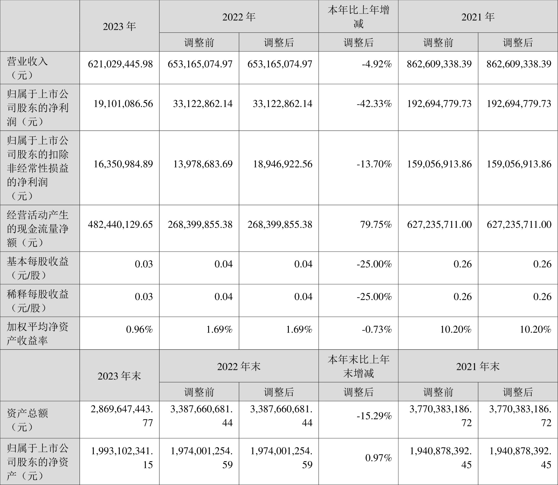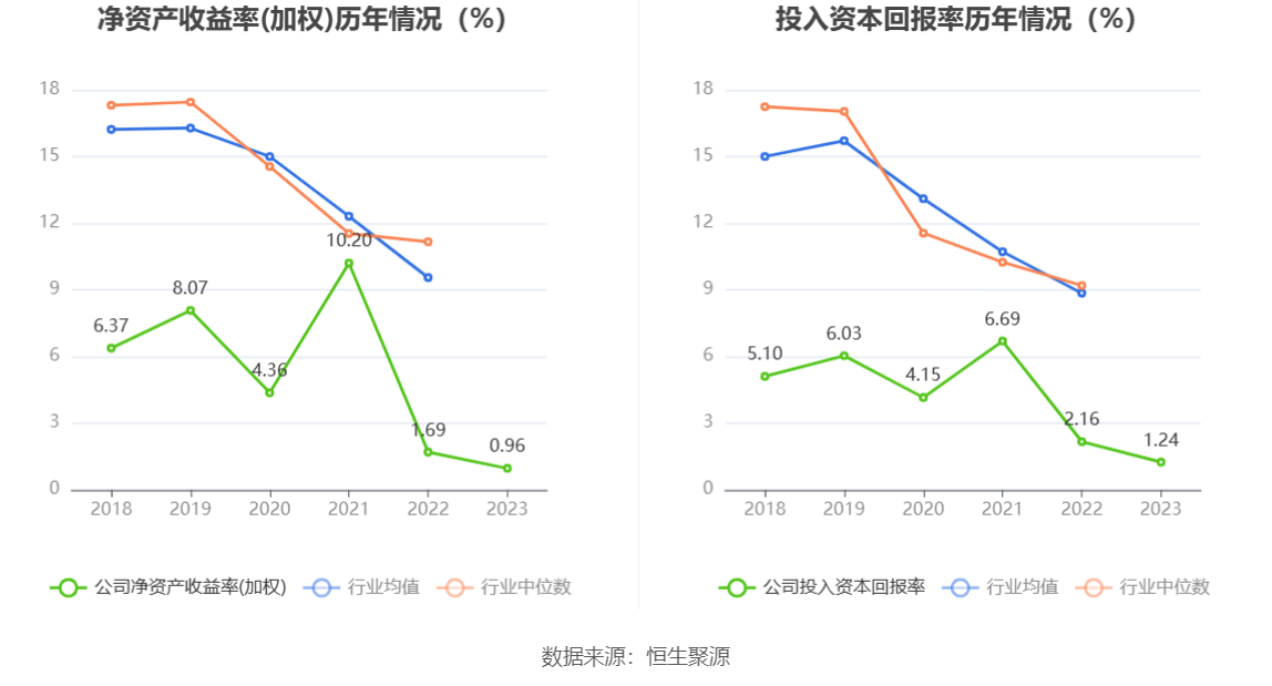 数据显示,2023年公司加权平均净资产收益率为0.96%,较上年同期下降0.73个百分点;公司2023年投入资本回报率为1.24%,较上年同期下降0.92个百分点。