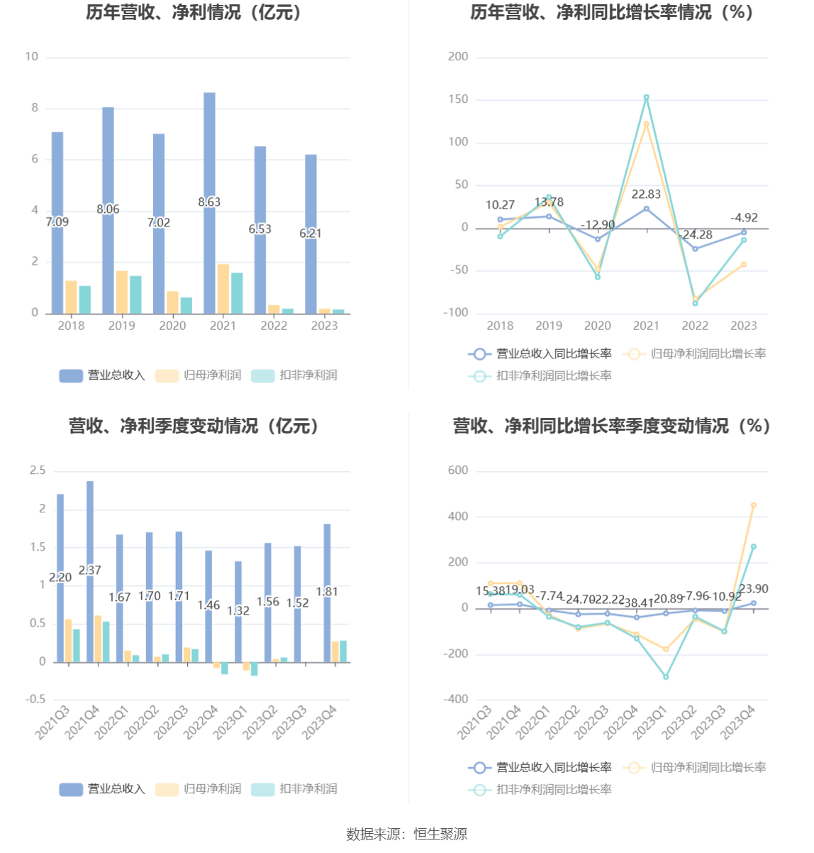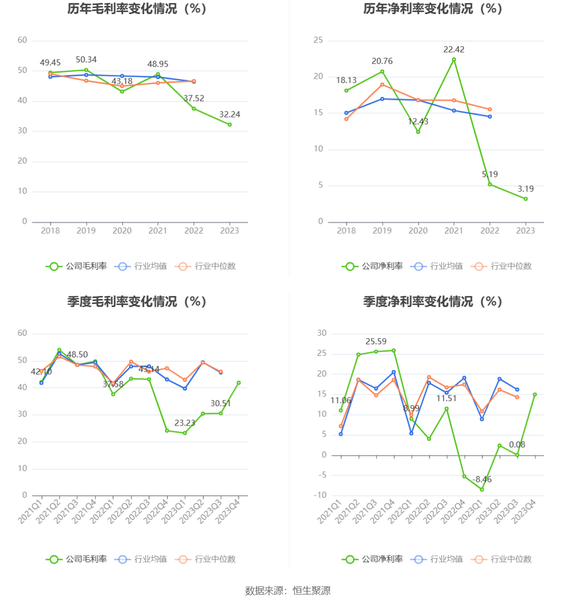 2023年,公司毛利率为32.24%,同比下降5.28个百分点;净利率为3.19%,较上年同期下降2.00个百分点。从单季度指标来看,2023年第四季度公司毛利率为41.85%,同比上升17.76个百分点,环比上升11.34个百分点;净利率为15.00%,较上年同期上升20.21个百分点,较上一季度上升14.92个百分点。