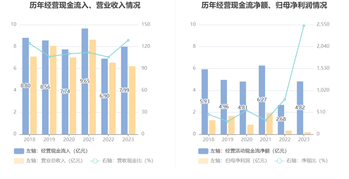 2023年,公司营业收入现金比为128.62%,净现比为2525.72%。
