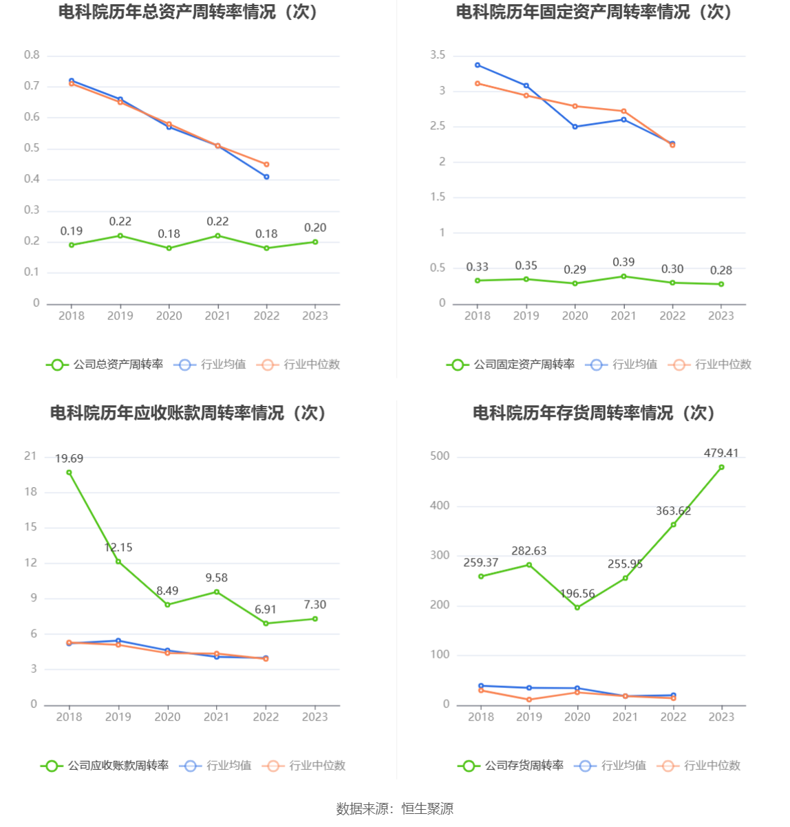 营运能力方面,2023年,公司公司总资产周转率为0.20次,上年同期为0.18次(2022年行业平均值为0.41次,公司位居同行业17/19);固定资产周转率为0.28次,上年同期为0.30次(2022年行业平均值为2.26次,公司位居同行业19/19);公司应收账款周转率、存货周转率分别为7.30次、479.41次。