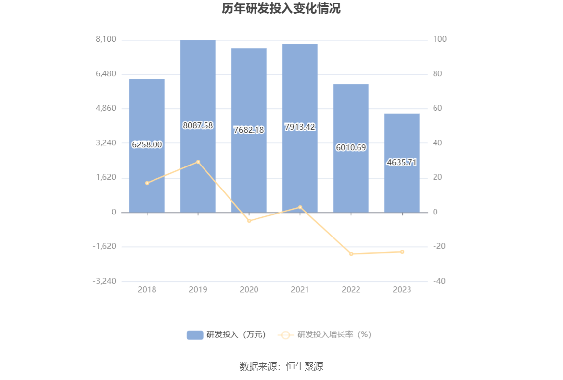 2023年全年,公司研发投入金额为4635.71万元,同比下降22.88%;研发投入占营业收入比例为7.46%,相比上年同期下降1.74个百分点。此外,公司全年研发投入资本化率为0。