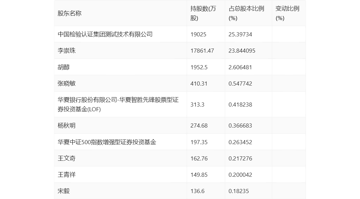 年报显示,2023年年末公司十大流通股东中,新进股东为华夏银行股份有限公司-华夏智胜先锋股票型证券投资基金(LOF)、华夏中证500指数增强型证券投资基金、宋毅,取代了三季度末的海南三原华庭物业服务有限公司、金林根、肖裕福。在具体持股比例上,中国检验认证集团测试技术有限公司、李崇珠、胡醇、张晓敏、杨秋明、王青祥持股有所上升,王文奇持股有所下降。