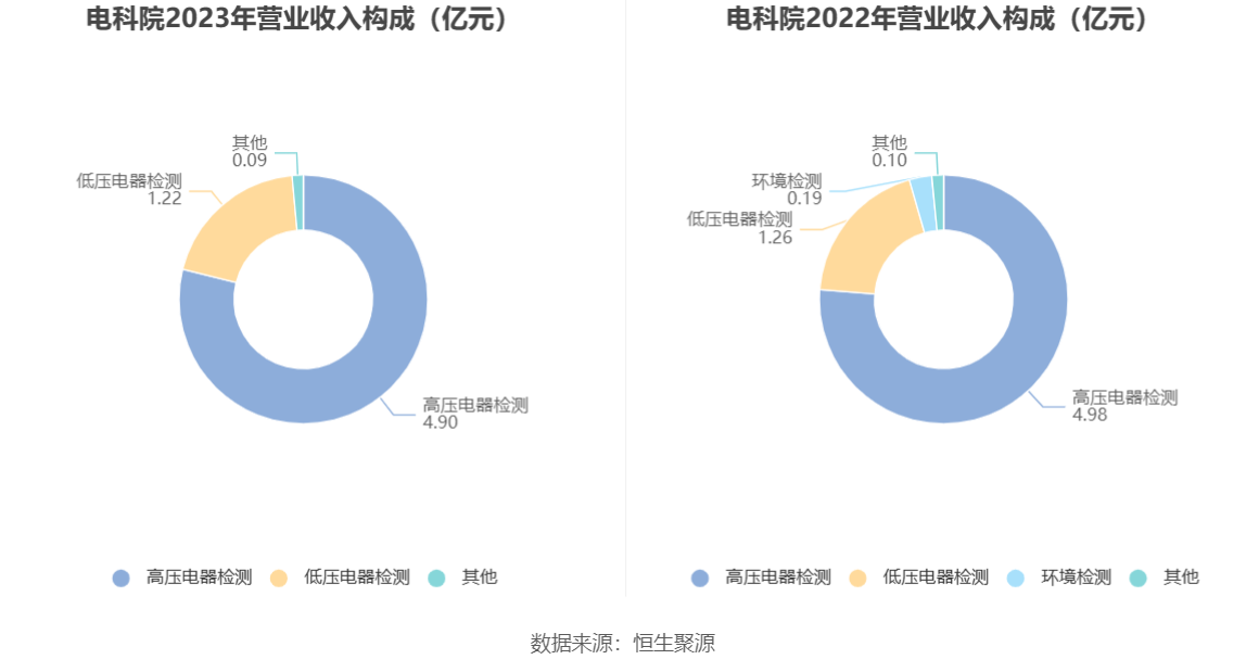 分产品来看,2023年公司主营业务中,高压电器检测收入4.90亿元,同比下降1.59%,占营业收入的78.86%;低压电器检测收入1.22亿元,同比下降3.17%,占营业收入的19.58%;环境检测收入0.00亿元,同比下降98.90%,占营业收入的0.03%。