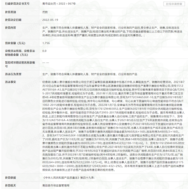 近日,意尔康股份有限公司因生产、销售不符合保障人体健康和人身、财产安全的国家标准、行业标准的产品,被青田县市场监督管理局罚款1.756万元。