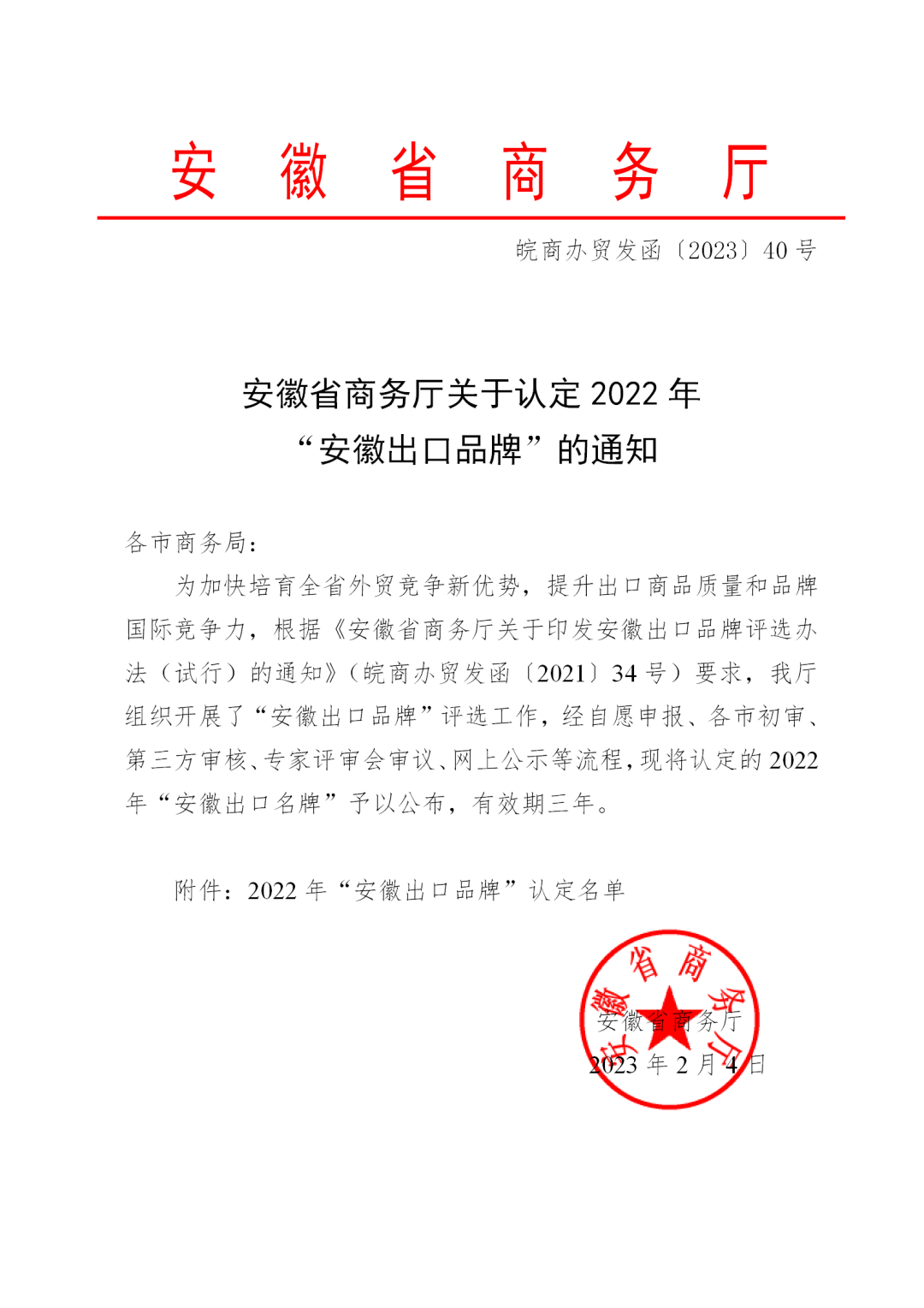 “安徽出口品牌”评选是为贯彻落实《安徽省做好稳外贸工作推进贸易高质量发展若干措施》(皖办发〔2020〕14号)文件精神,旨在以培育和发展国际知名品牌为目标,提升出口商品质量、品牌国际竞争力和品牌影响力。此次评选从企业品牌出口规模、研发能力、质量基础设施能力情况、品牌国际运营和推广、知识产权保护等多方面进行评分,经自愿申报、地市初审、第三方审核、专家评审会复审、集中公示等多项程序后,最终确定入选名单,入选企业均为出口上规模、质量有保证、海外有影响的优质出口品牌企业。