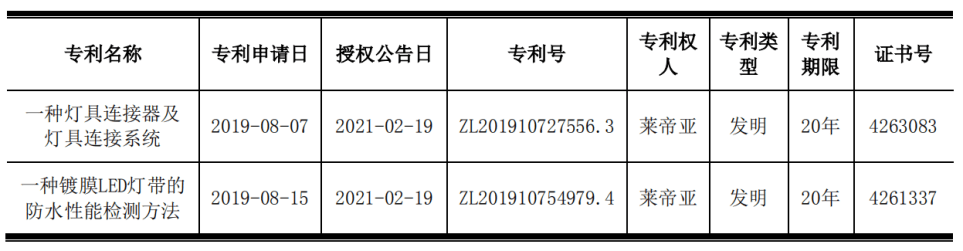 据悉,第一项专利名为“一种灯具连接器及灯具连接系统”,专利号为ZL201910727556.3。国家知识产权局信息显示,本发明连接器的结构、制造和装配都相对简单。