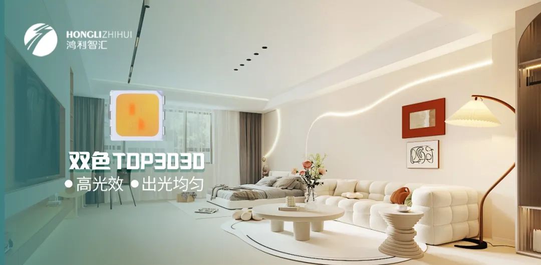 鸿利智汇针对智能照明的控光需求,采用鸿利“第三代”双色调光技术,推出双色TOP3030产品,将高色温与低色温两种不同光色放在同一个支架碗杯中,实现高光效、高密度、高可靠性、优化出光均匀性等特点,实现出色的色彩混合。