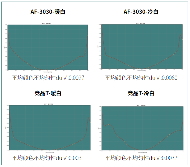 通过以上测试结果来看,AF-3030暖白产品的平均颜色不均匀性为du''v'':0.0027,AF-3030冷白产品平均颜色不均匀性为du''v'':0.0060,AF-3030暖白冷白光色均匀性优于竞品T。