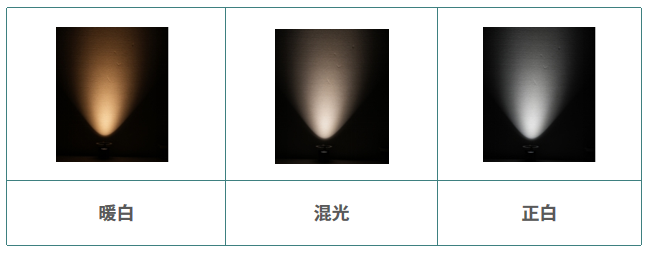 在本系列主推产品中,在典型场景应用中照射光斑,分别为暖白、正白、混光效果,如下图所示: