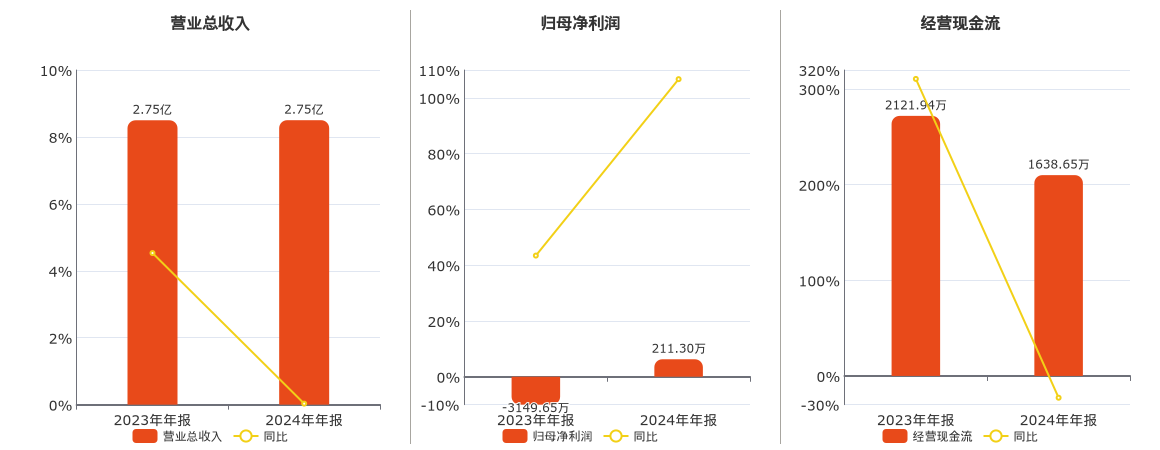 公司营业总收入为2.75亿元,在已披露的同业公司中排名第13。归母净利润为211.30万元,在已披露的同业公司中排名第12。经营活动现金净流入为1638.65万元,在已披露的同业公司中排名第11,较去年同报告期经营活动现金净流入减少483.29万元,同比较去年同期下降22.78%。