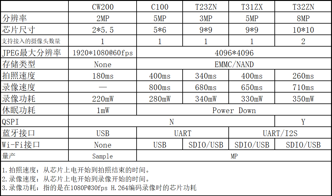 C100是目前已量产的极小尺寸ISP芯片,能支持500万像素。其优势不止是尺寸极小,在录像功耗、启动速度方面也进行了极致优化,是500万像素AI眼镜最优选择。T系列作为君正主力视频处理芯片,方案成熟稳定。
