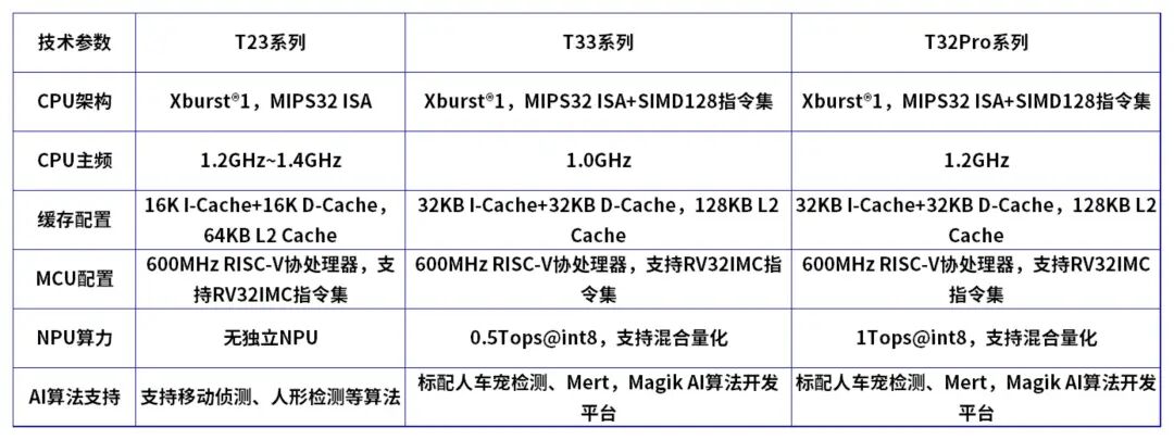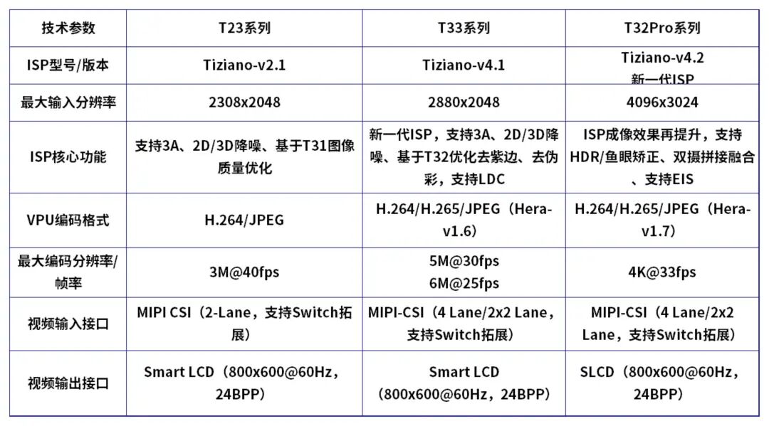 ?核心定位为入门级 H.265+AI SOC,是 T23 的全面升级、T32Pro 的普惠版,集成 H.265 高效编码器和 0.5T 独立 NPU,以“低功耗+高画质+普惠 AI”为核心优势,打破高端 AI 视觉技术的应用壁垒。