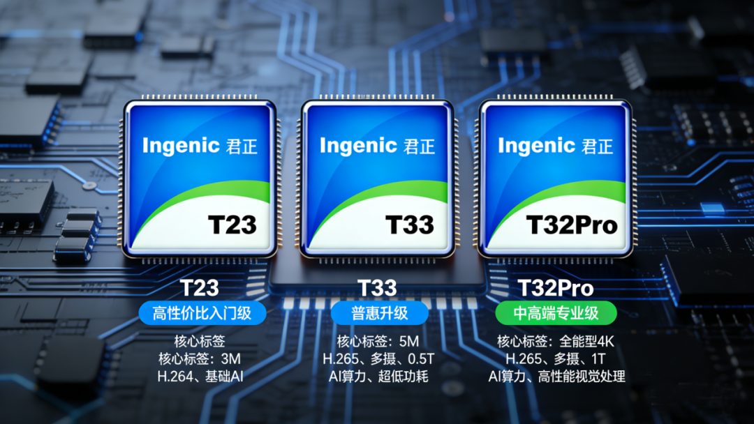 北京君正推出的T23、T33及T32Pro系列智能视觉处理器,均面向视频设备应用场景,涵盖移动摄像、安防监控、视频通话、视频分析等领域。三款系列处理器基于不同产品定位,形成从高性价比入门到中高端专业的产品矩阵,在性能、功耗、功能特性上各有侧重,且均保持硬件兼容性与软件生态一致性,满足不同层级的产品开发需求。