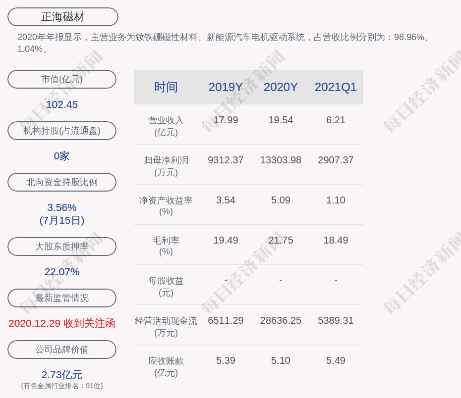 2020年年报显示,正海磁材的主营业务为钕铁硼磁性材料、新能源汽车电机驱动系统,占营收比例分别为:98.96%、1.04%。