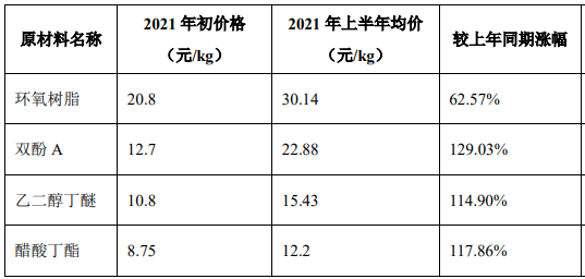 同时,金力泰对公司2021上半年净利润下滑的原因做出了说明,金力泰表示,受全球化工原料价格持续上涨的影响,公司原材料采购金额较上年同期增长较大,主要原材料例如环氧树脂、双酚A等价格均于今年二季度创下历史新高,其他原材料也有不同程度的涨幅,对公司的利润侵蚀较为严重。