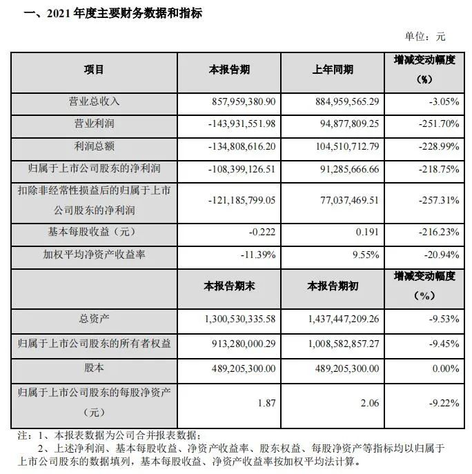 业绩快报显示,报告期公司实现营业总收入85795.94万元,较上年同期减少3.05%;营业利润为-14393.16万元,较上年同期减少251.70%;利润总额为-13480.86万元,较上年同期减少228.99%;归属于上市公司股东的净利润为-10839.91万元,较上年同期减少218.75%;报告期内,公司基本每股收益为-0.222元,较上年同期下降216.23%。