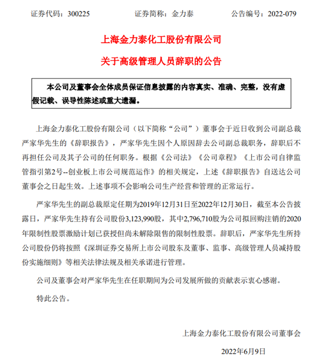 收购罗甸持有的上海金杜49%股权的同日,金力泰董事会亦收到公司副总裁严家华的《辞职报告》,严家华因个人原因辞去公司副总裁职务,辞职后不再担任公司及其子公司的任何职务。