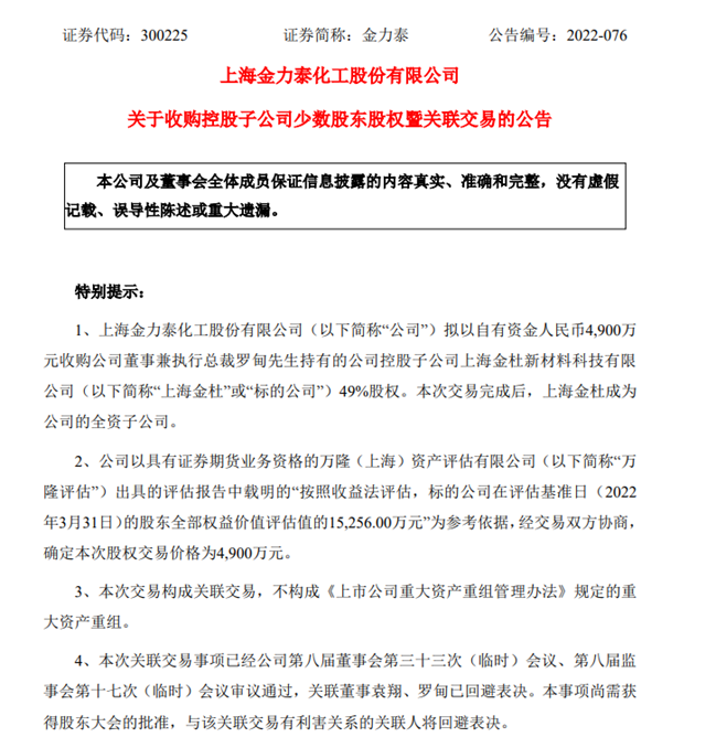金力泰披露,为大力发展具有高附加值的轻金属表面处理业务及3C涂料业务,公司拟以自有资金4900万元收购公司董事兼执行总裁罗甸持有的公司控股子公司上海金杜49%股权。本次交易完成后,上海金杜新材料科技有限公司(简称“上海金杜”)成为公司的全资子公司。
