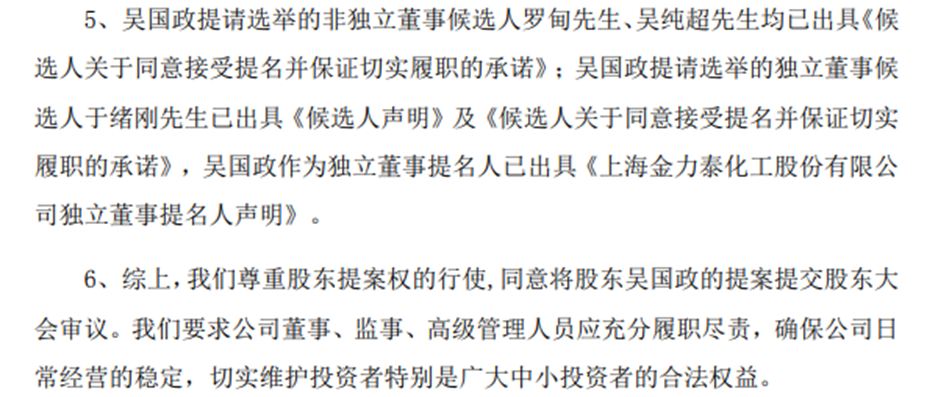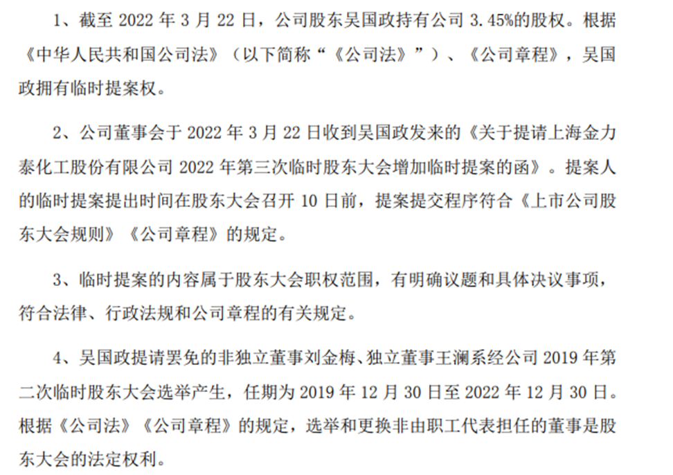 对于吴国政提议罢免的董事,金力泰表示,是因为这几位董事无端指责、捏造事实,给公司造成极大负面影响,可能导致投资人及公司损失。